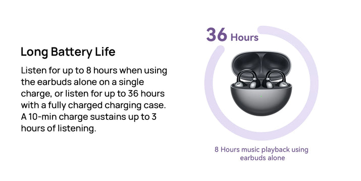 Answer 1: The earphones offer an impressive battery life of up to 36 hours, ensuring you can use them throughout the day without needing frequent charges.