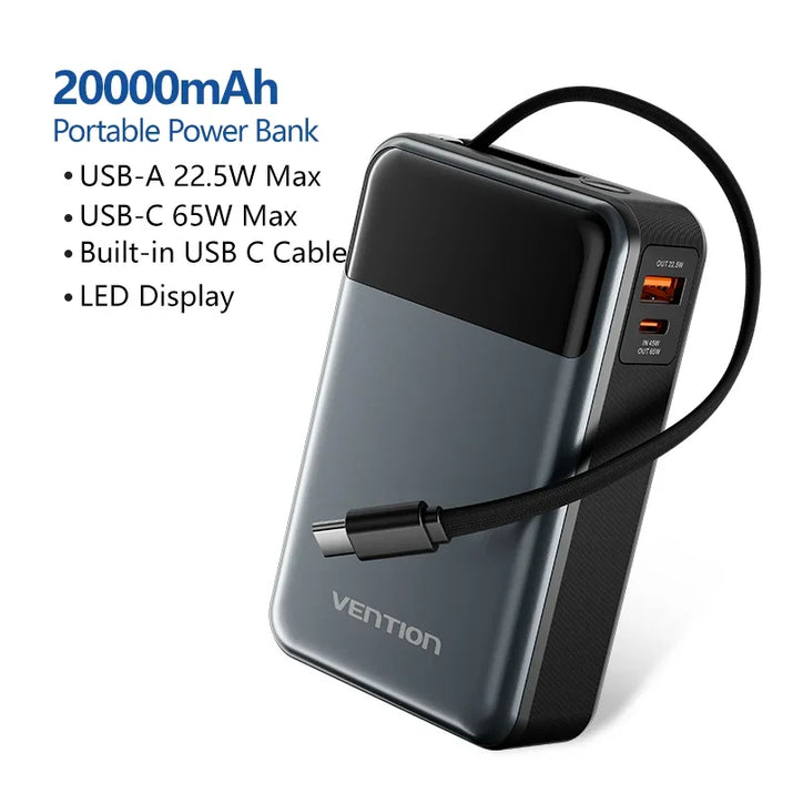 Stay powered on-the-go with this high-capacity portable power bank, featuring 20000mAh capacity and a rapid 65W charging capability, perfect for laptops and devices needing a quick boost.